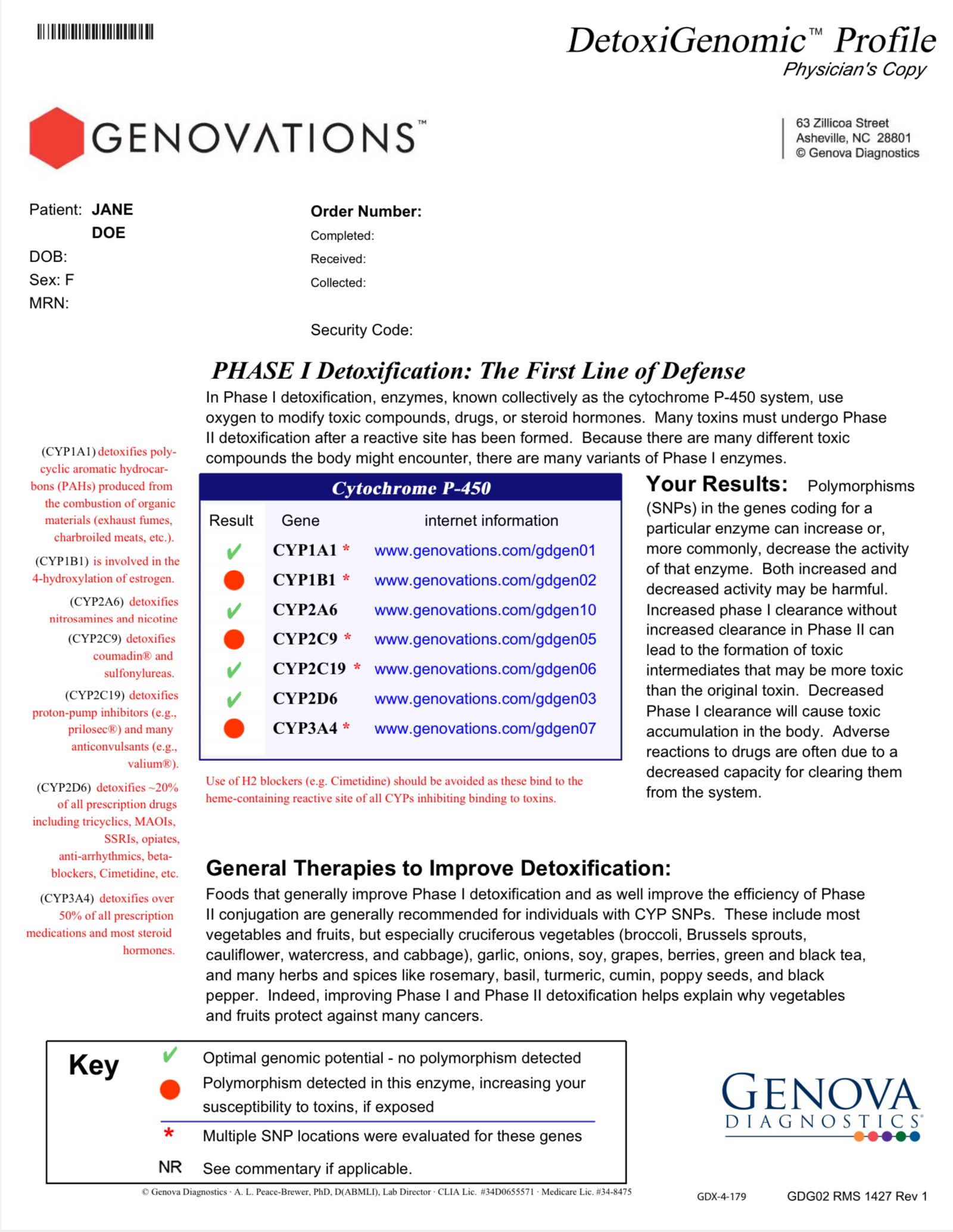 The DetoxiGenomic® Profile is a genetic (SNP) test that identifies inherited variations in genes responsible for detoxification, methylation, and oxidative stress pathways.